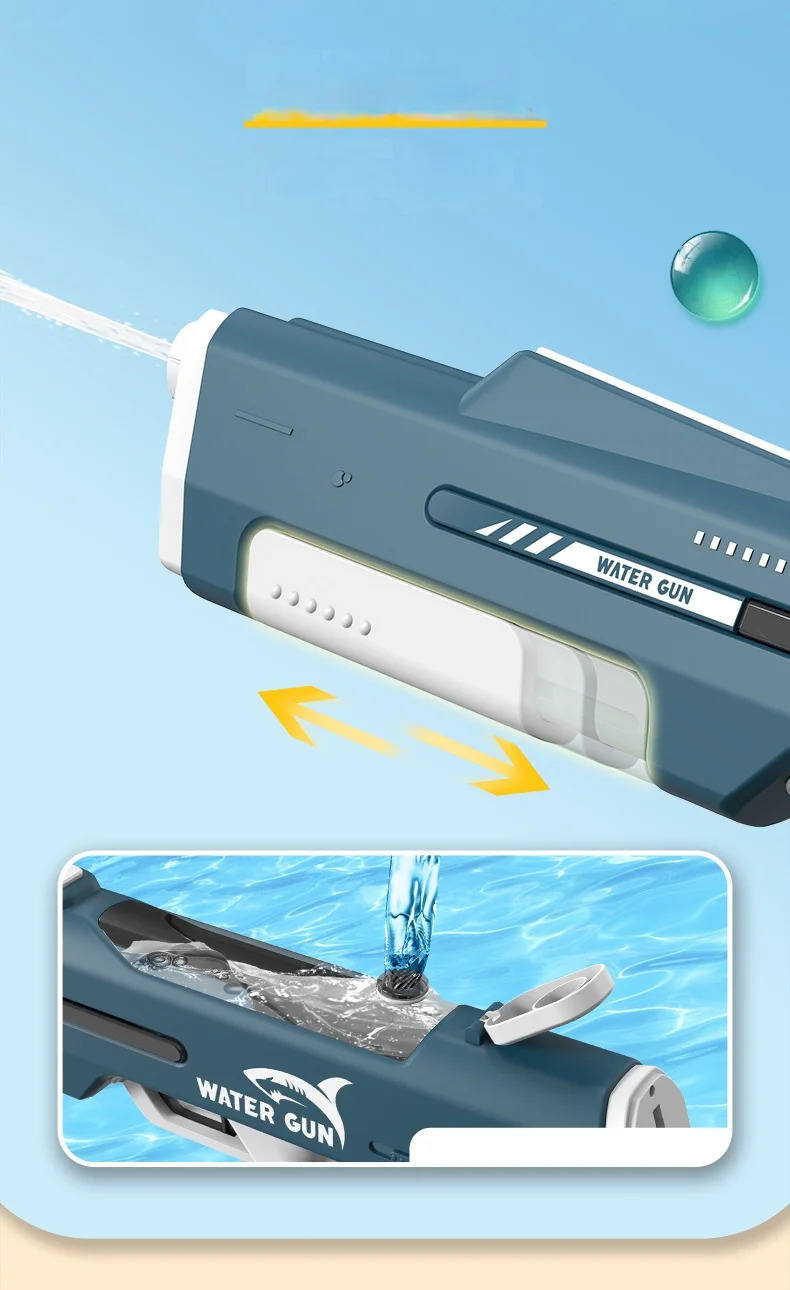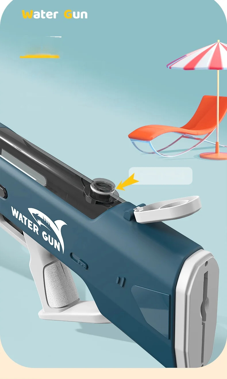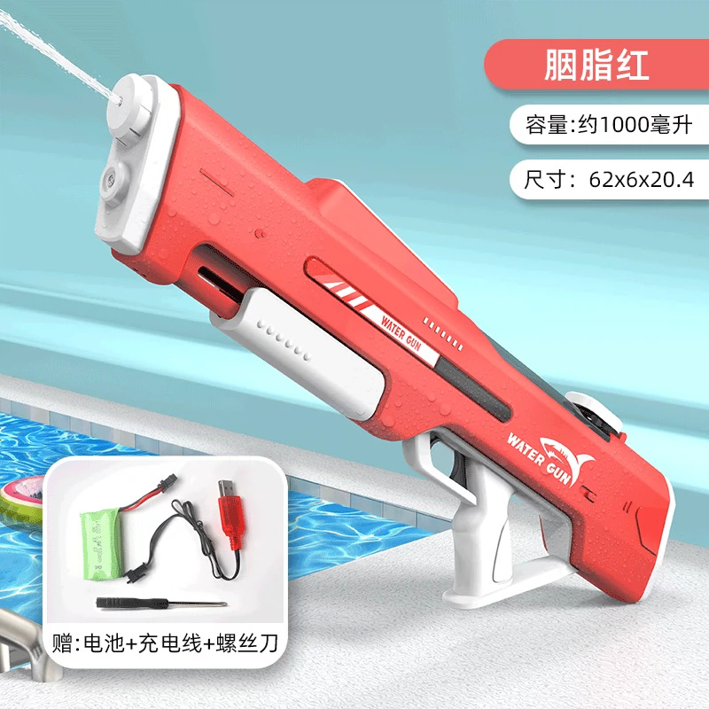 - Pistola eléctrica, completamente automática, con disparo rápido, continuo y estable. No es necesario ir apretando continuamente el botón de disparo como el resto de las pistolas de agua.